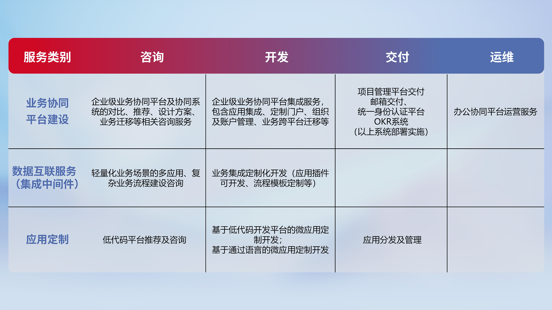 针对钉钉、、企微、、、、IDaas等平台级产品提供产品的规划、、、、方案、、交付、、、、定制化开发等服务,,实现如统一协同办公、、智能客户服务、、混合会议管理、、智能数据查询、、、等业务场景,,,实现数字化转型。。。。