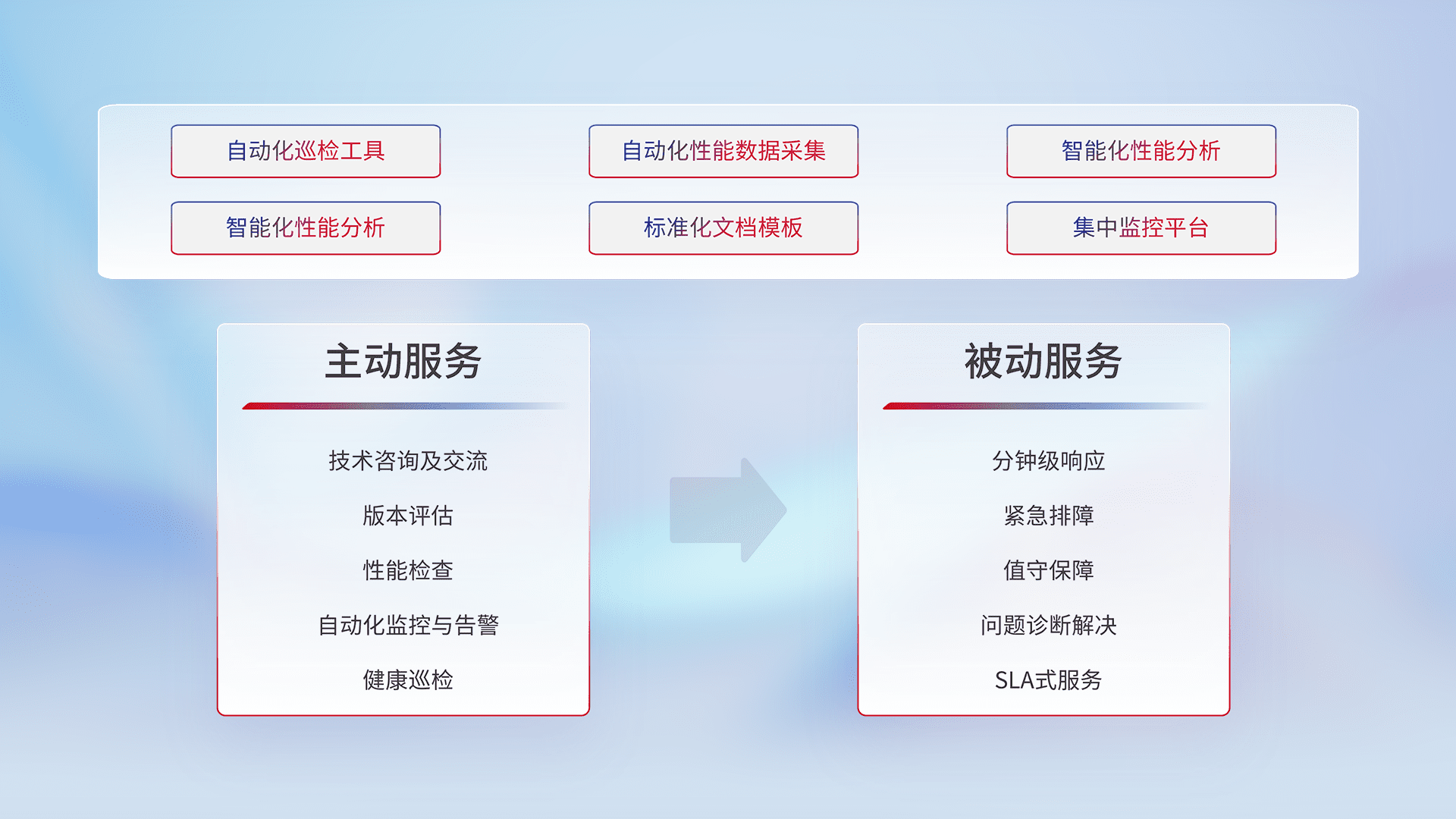 智能化工具和标准化文档,,,,保障服务质量,,,,提供主动服务(包含技术咨询、、版本评估、、、性能检查、、自动化监控与告警、、、、健康巡检)和被动服务包含(分钟级响应、、紧急排障、、、、值守保障、、、问题诊断解决、、SLA服务)。。。。